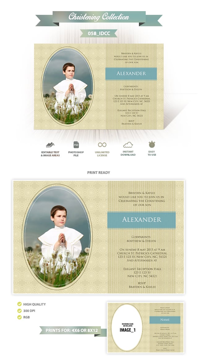 This Christening Invitation Design 058, Is a Photoshop psd file, easy to use christening invitation design template, works great with Adobe Photoshop, just double click the replace image layer, and if you like this Photoshop psd Christening Invitation Design 058 template, just click the buy button and download it.